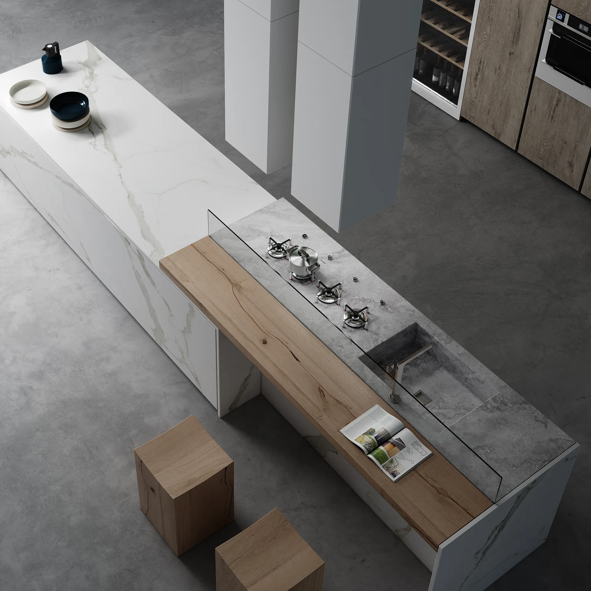 Versatile surfaces that bring design continuity from worktops to statement pieces.